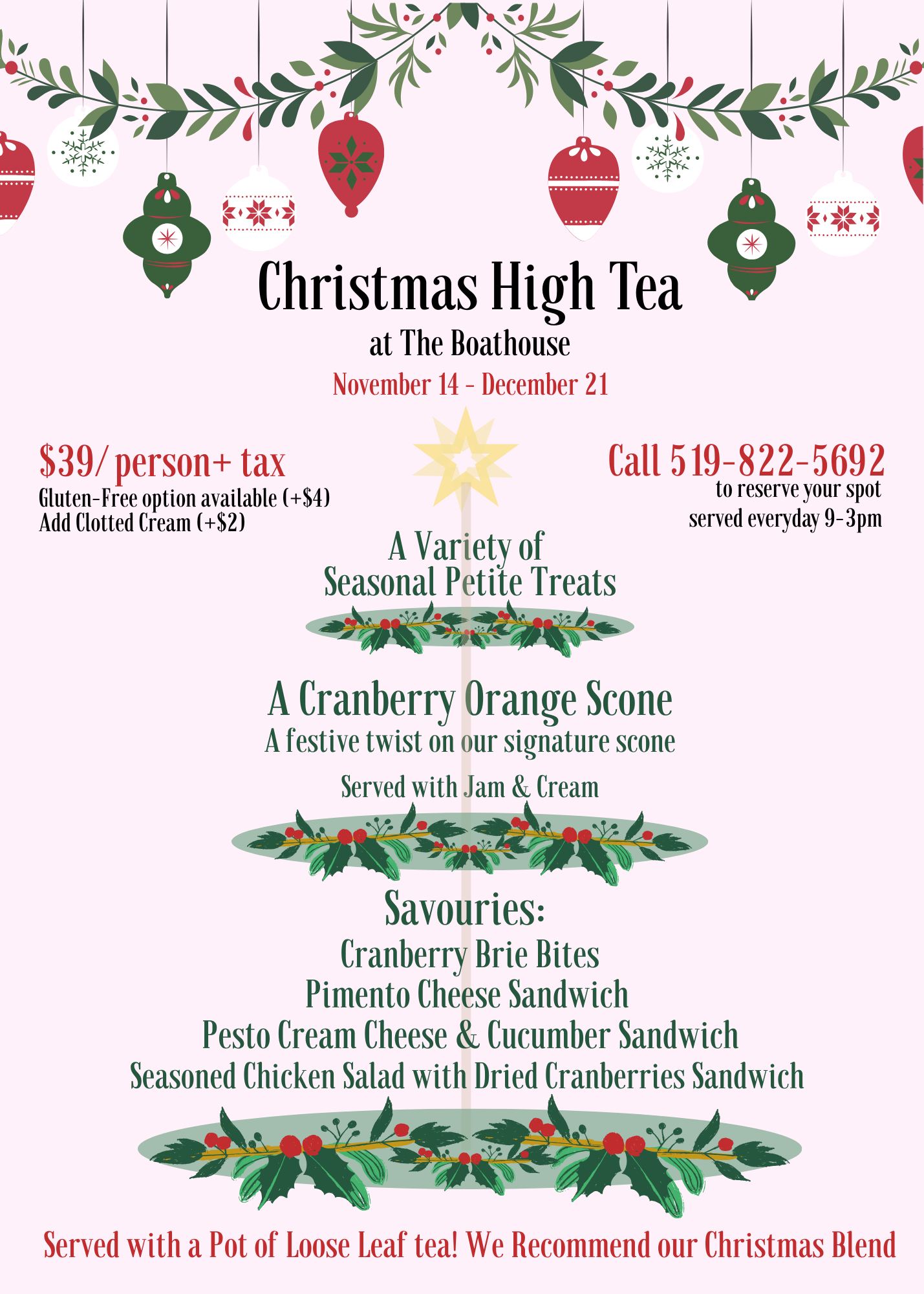 petit sweets, assorted tea sandwiches and cranberry brie bites, a festive twist on our signature scone (served with jam & cream), with your choice of a pot of loose leaf tea. Garnished with fresh fruit.